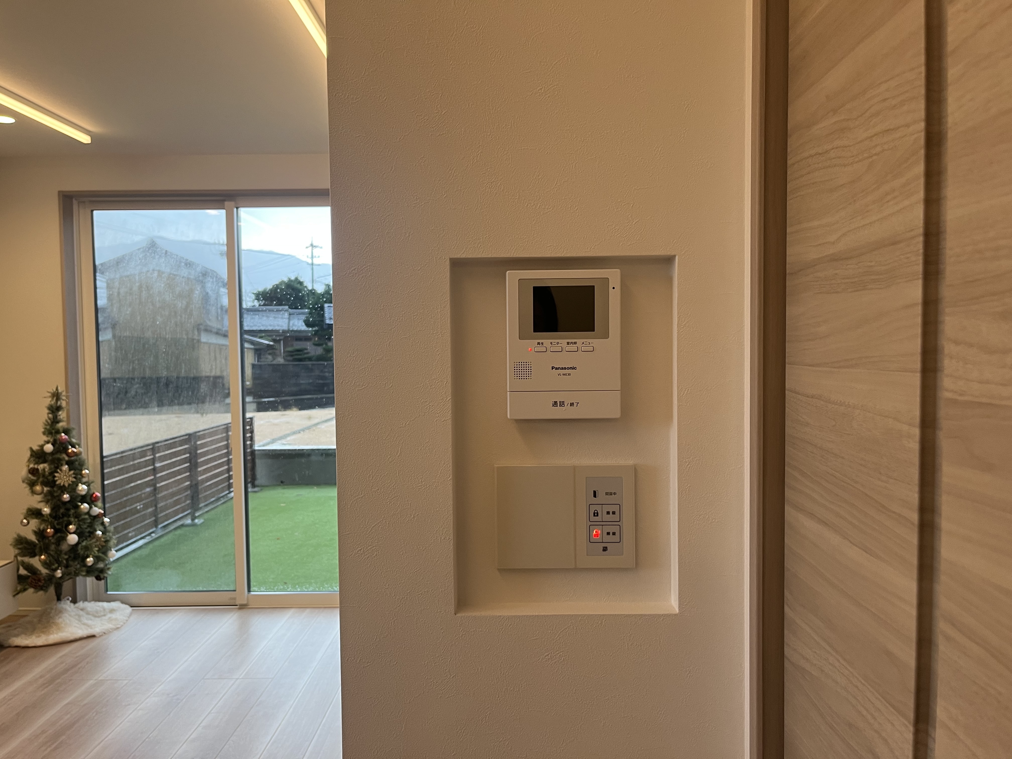 リビングでは、インターホンやスイッチ類を壁の中にスッキリおさめました。